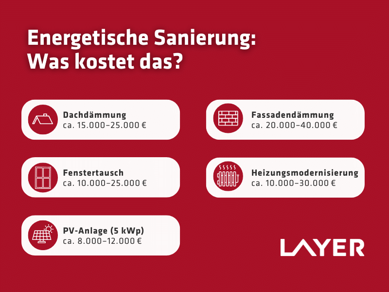 Fassadendämmung (Vollwärmeschutz oder hinterlüftete Fassade) | ca. 20.000–40.000 € | Bis zu 20 % Zuschuss, ggf. Kombination mit Steuerbonus möglich |