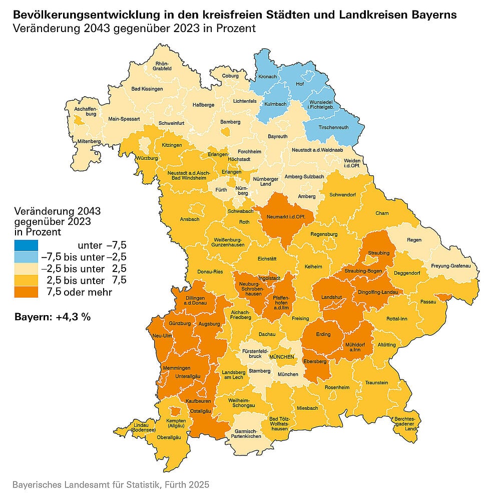 Die Wachstumsschwerpunkte zeigen sich insbesondere in den Regierungsbezirken Oberpfalz, Oberbayern sowie Mittelfranken. Hier wird für einzelne Kommunen von einem Zuwachs von über 20 Prozent ausgegangen. In Oberbayern liegen die Regionen mit dem höchsten Wachstum vor allem in den Orten zwischen Ingolstadt und München. Den größten Einwohnerzuwachs wird laut Berechnung die Gemeinde Pfaffenhofen an der Glonn im Kreis Dachau verzeichnen: Hier wird mit einem Anstieg um 23,3 Prozent auf insgesamt 2.770 Bürger und Bürgerinnen kalkuliert.